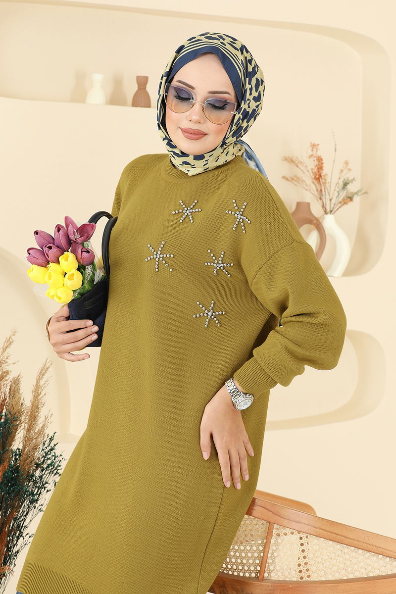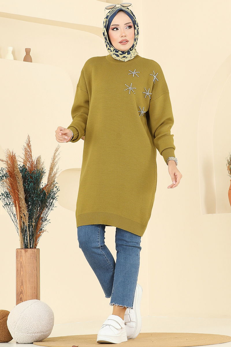 Taş Detaylı Triko Tunik Yağ Yeşili