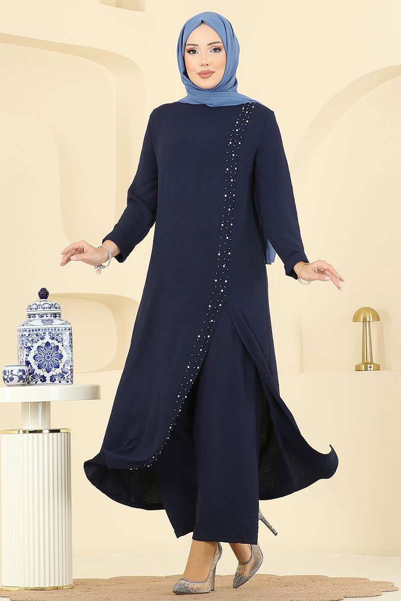 Elegant ve modern tasarımıyla dikkat çeken Taş Detaylı Yırtmaçlı Takım, KOMBİN model tesettür ürünüdür. Dört Mevsim boyunca rahatlıkla tercih edebileceğiniz bu takım, 30 derecede hassas yıkama imkanı sunar. Aerobin kumaş kullanılarak üretilmiş olan bu takım, yarım hakim yaka ve sırttan fermuarlı yapısıyla kullanışlılık sağlar. Tunik, önündeki yırtmaç detayı ile hareket özgürlüğü kazandırırken, taş ve boncuk işlemeleri şıklığı arttırır. Elastik bel pantolonu ise gün boyu konfor sunar.