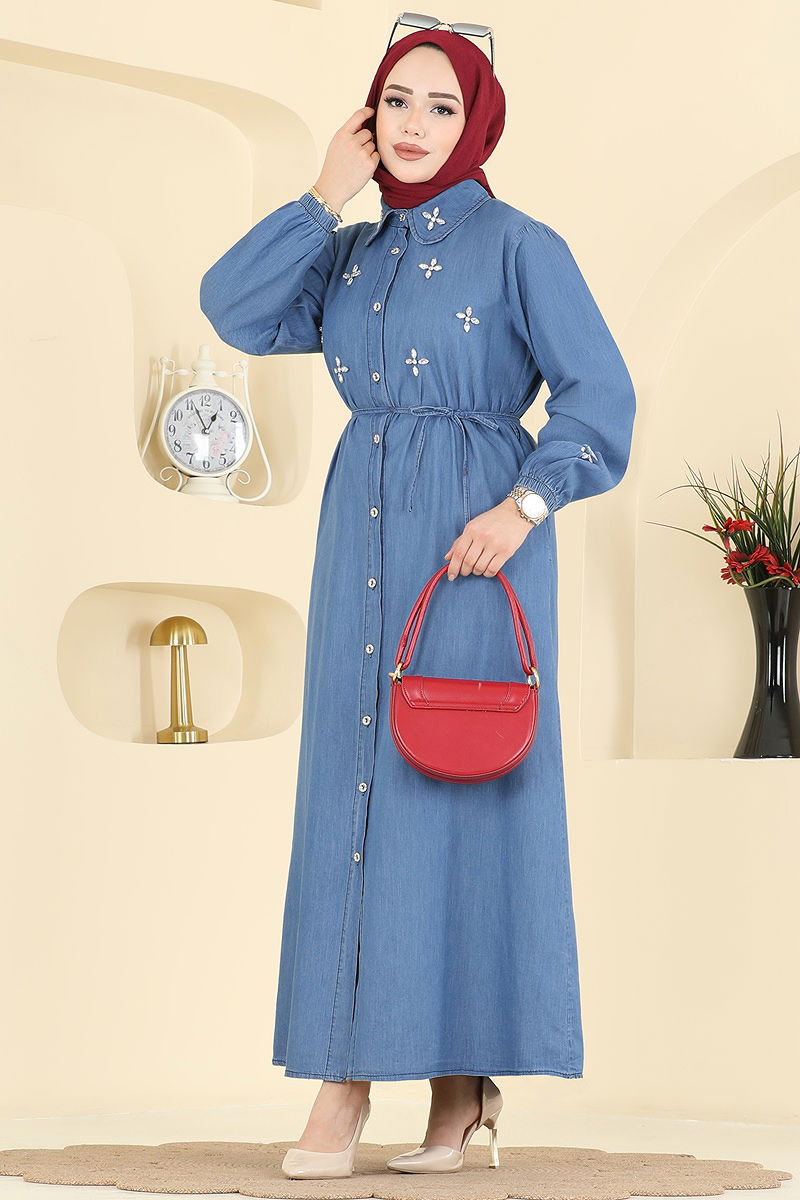 Taş İşlemeli Kot Elbise 1109MSA980 Açık Kot