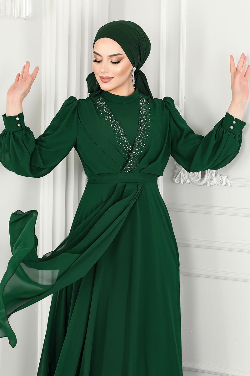 Stone-embellished Chiffon Evening Gown. This model is a hijab evening dress suitable for all seasons. Dry cleaning only. It is made of first-class chiffon fabric. The product has a half-sheath collar. It's lined. Back zippered.(The product on the model is size 38.)Height: 160 cm, Bust: 86 cm, Waist: 68 cm, Hip: 95 cm, Weight: 52 kg. The pearl details are appliqued. The two ends of the belt are sewn to prevent fluttering, and the middle part is left empty (seamless). The belt is included in the product and is optional to use. Stones are adhesive.