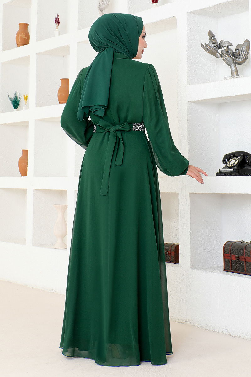 Taş İşlemeli Şifon Abiye LPN6025-M Zümrüt