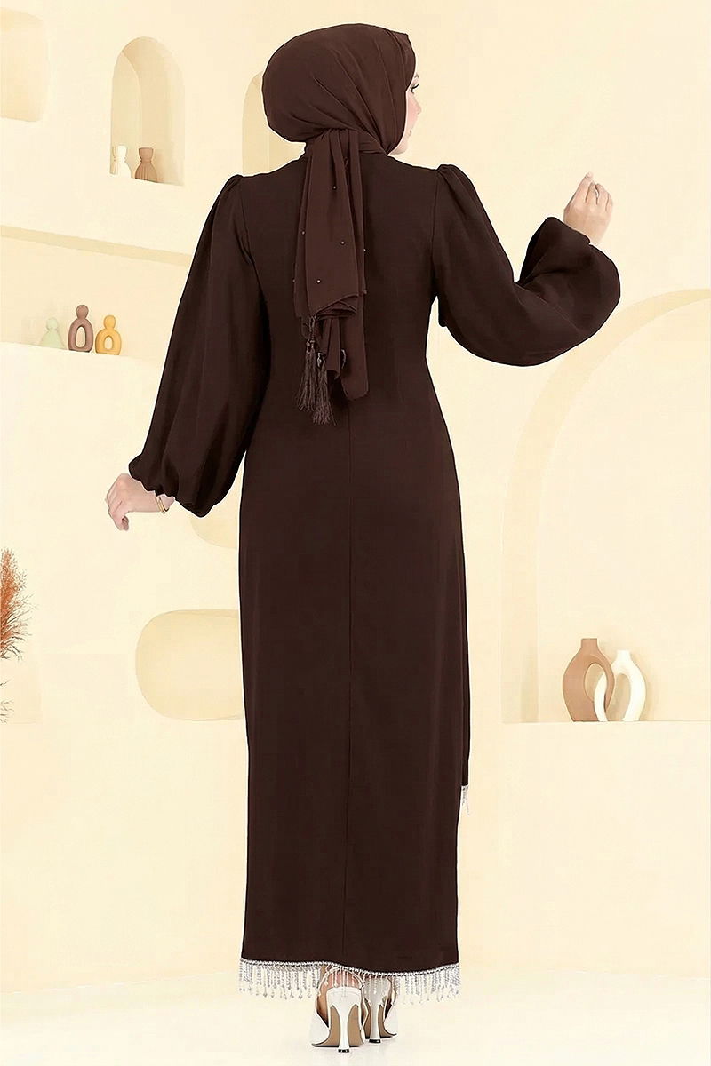 Taşlı Abiye Elbise Kahve
