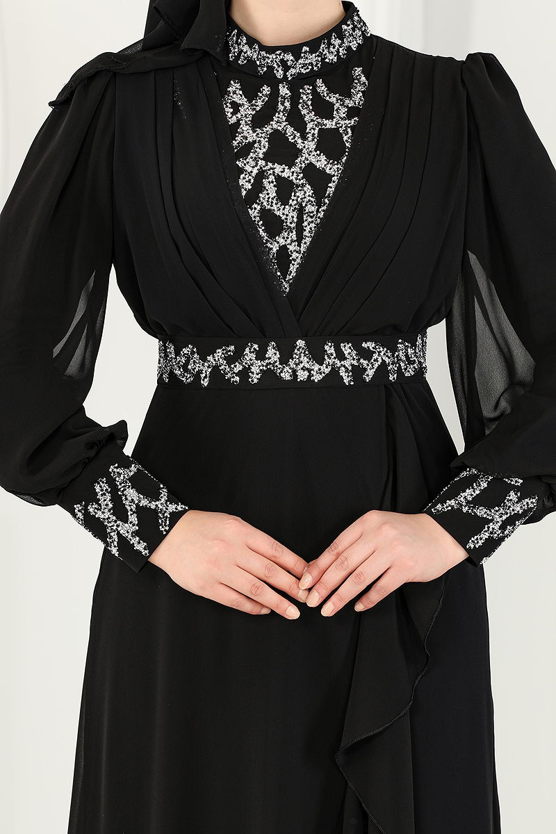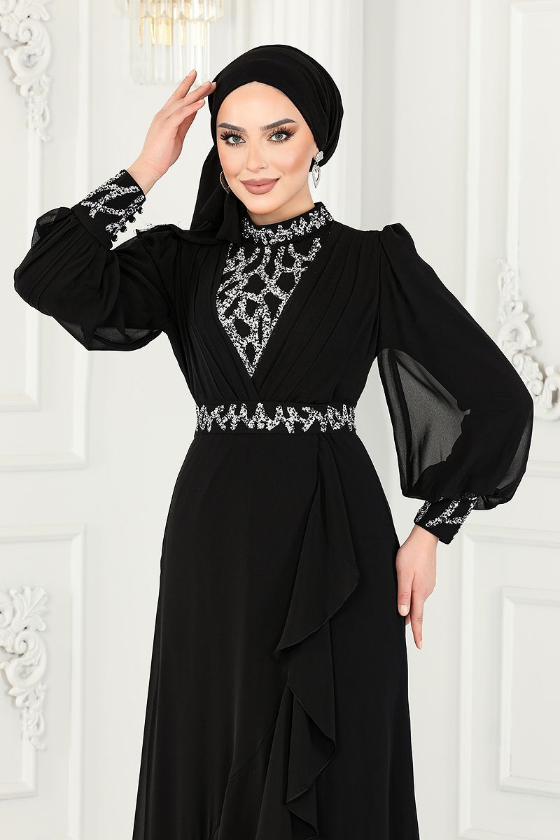 Taşlı Eteği Volanlı Şifon Abiye Siyah