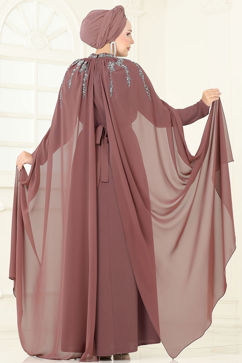 Taşlı Pelerinli Şifon Abiye Koyu Pudra Vizyon