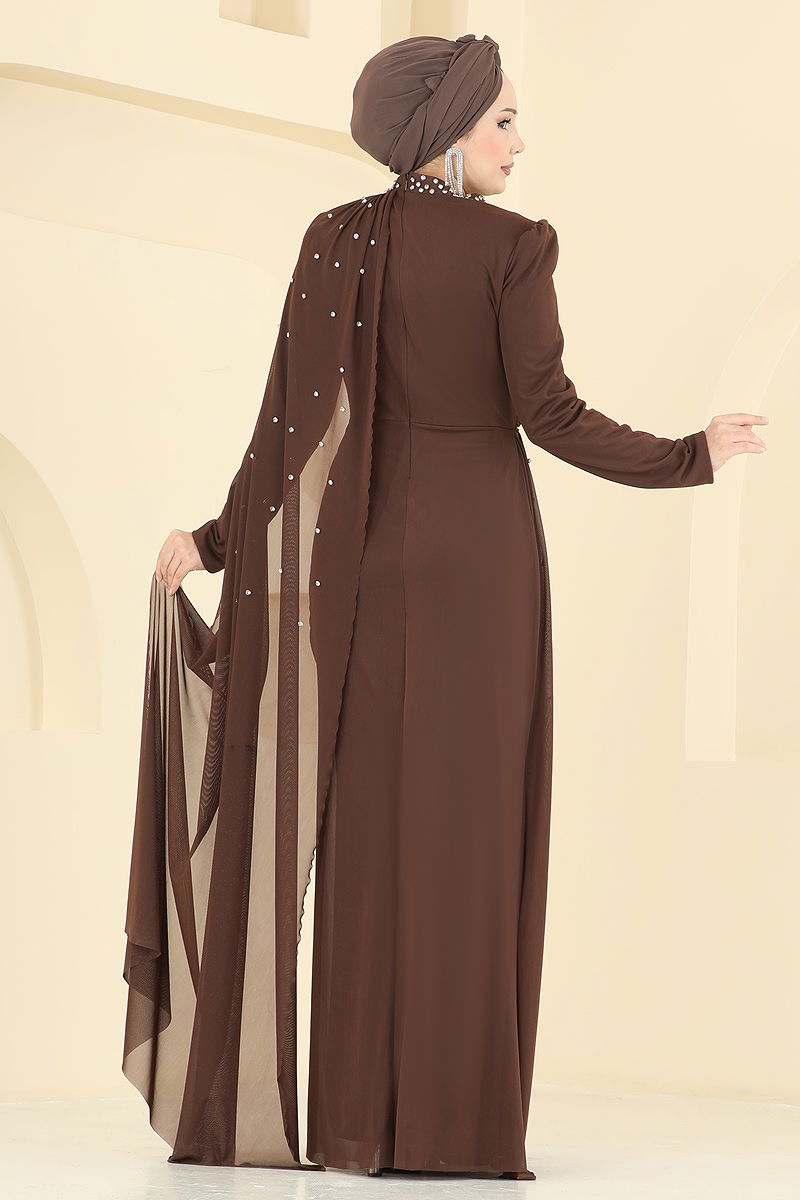 Taşlı Pelerinli Tül Abiye Kahve