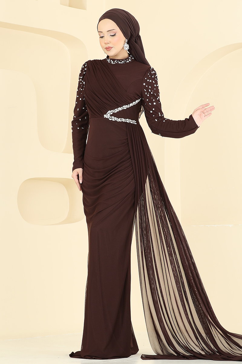 Taşlı Pelerinli Tül Abiye 5742EDF311 Kahve