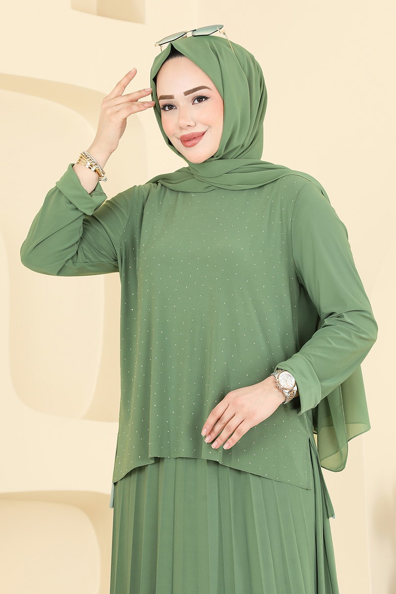 Taşlı Pilise Etekli Takım, zarif tesettür modasını benimseyenler için ideal bir seçimdir. Her mevsim rahatlıkla kullanabileceğiniz bu ürün, sandy kumaşın dayanıklılığı ve nefes alabilir özelliği ile dikkat çeker. Taş detaylarıyla süslenmiş olan bluz, bisiklet yakası ile modern bir dokunuş katarken, pilise etek zarif ve feminen bir silüet sunar. 30 derecede hassas yıkama ile temizliği yapılabilir.