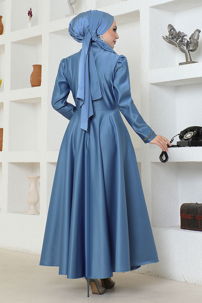 Taşlı Saten Şık Elbise YGS6357-M İndigo