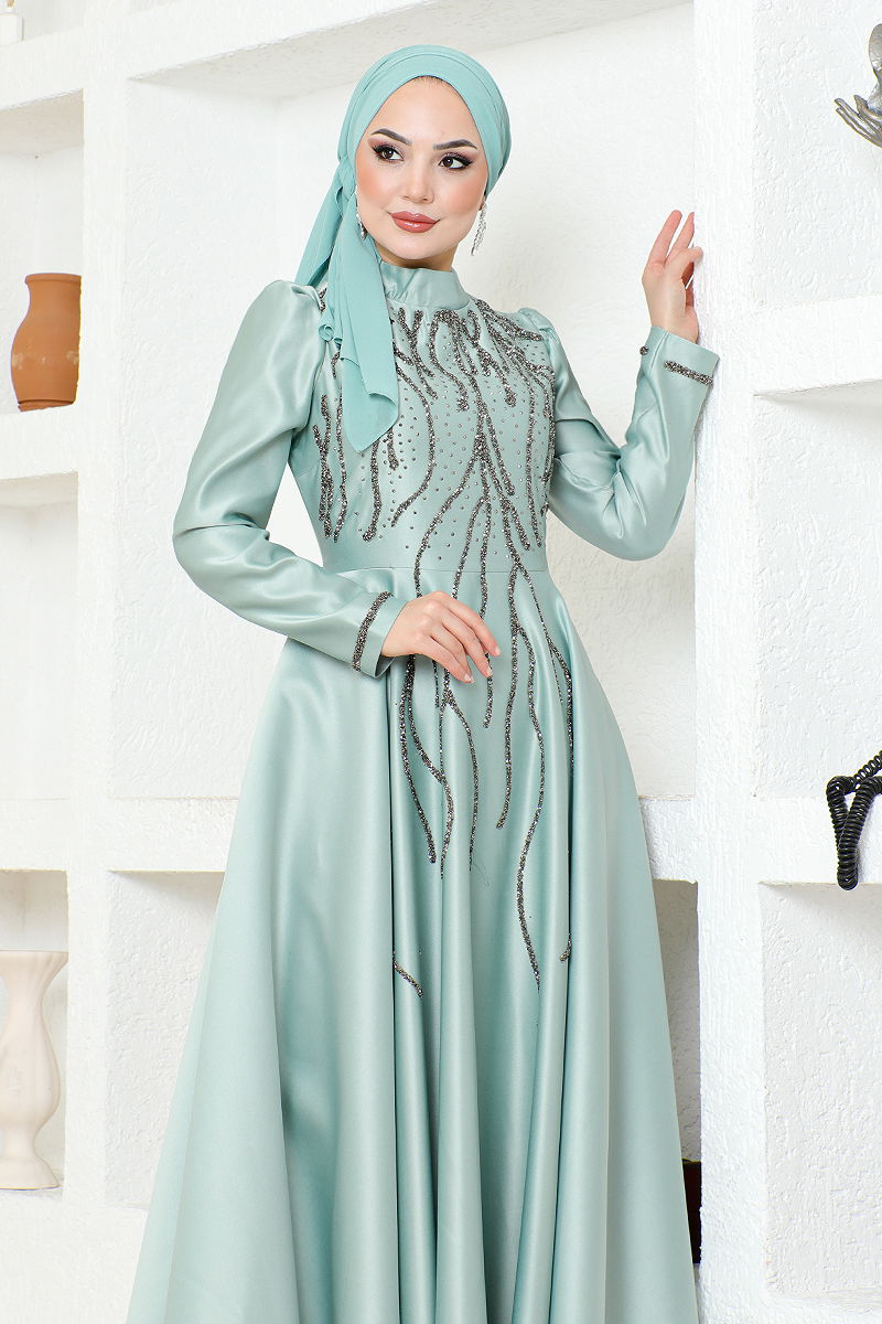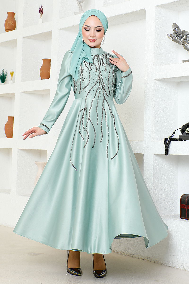 Taşlı Saten Şık Elbise YGS6357-M Mint