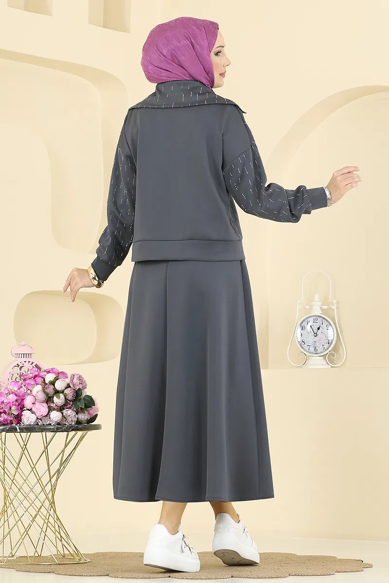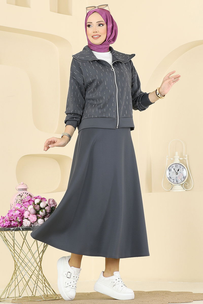 Taşlı Scuba Etekli Takım, tesettür giyim sevenler için özel olarak tasarlanmıştır. Dört mevsim rahatlıkla giyilebilen bu özel kombin, hassas yıkama ile 30 derecede yıkanabilir özelliğiyle dikkat çeker. Scuba kumaş kullanılarak üretilen bu takım, dik yaka tasarımına sahiptir ve astarsızdır. Modelin ön kısmında kullanılan fermuar, hem şıklık hem de pratiklik katar. Taş detayları yapıştırma olup, etek beli lastikli yapıda tasarlanmıştır ve sizlere konfor sunar. Model üzerindeki ürün M bedendir ve kombin olarak hırka ve etekten oluşmaktadır.