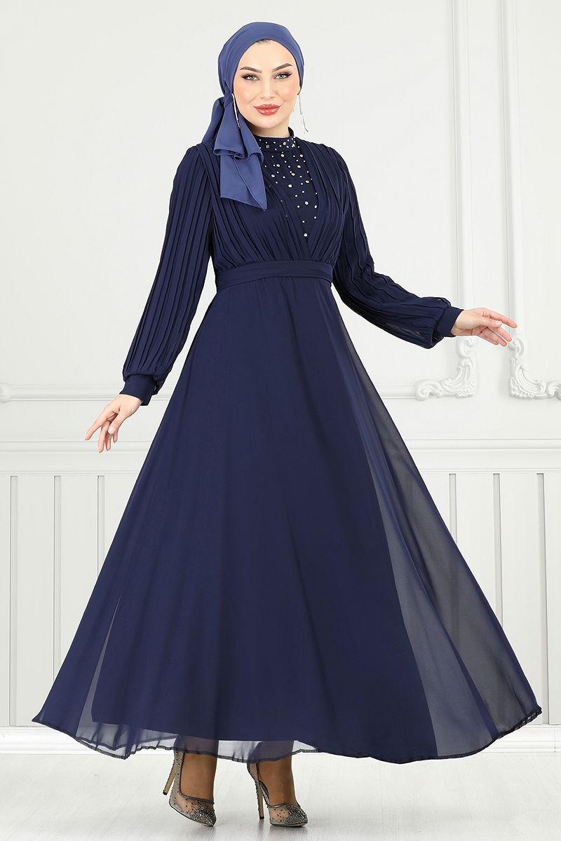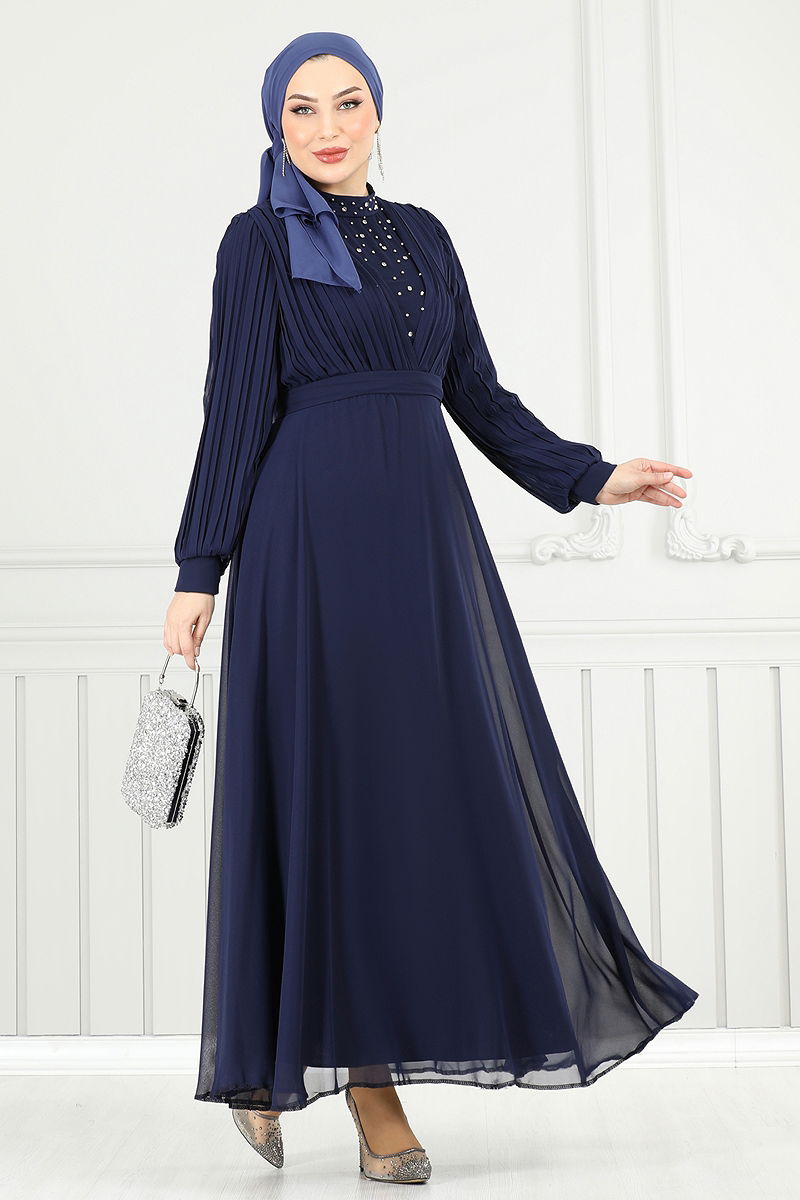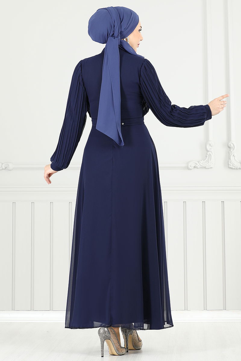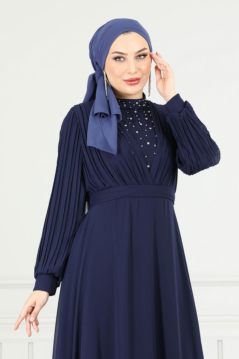 Şıklığı ve zarafeti bir arada sunan Taş Detaylı Şifon Abiye, dört mevsim boyunca tercih edebileceğiniz ideal bir tesettür abiye modelidir. Sadece kuru temizleme ile temizlenmesi gereken bu ürün, şifon kumaştan üretilmiştir ve astarlıdır. Hakim yaka tasarımına sahip olan abiye, sırttan fermuarlıdır ve rahat bir kullanım sunar. Üzerindeki inci ve taş detayları ile dikkat çeken abiye, ayrıca dikilmiş uçları olan bir kemerle tamamlanmaktadır. Bu kemer, abiyeyle birlikte gelir ancak kullanımı tamamen isteğe bağlıdır. Modelin üzerindeki ürün 38 bedendir.