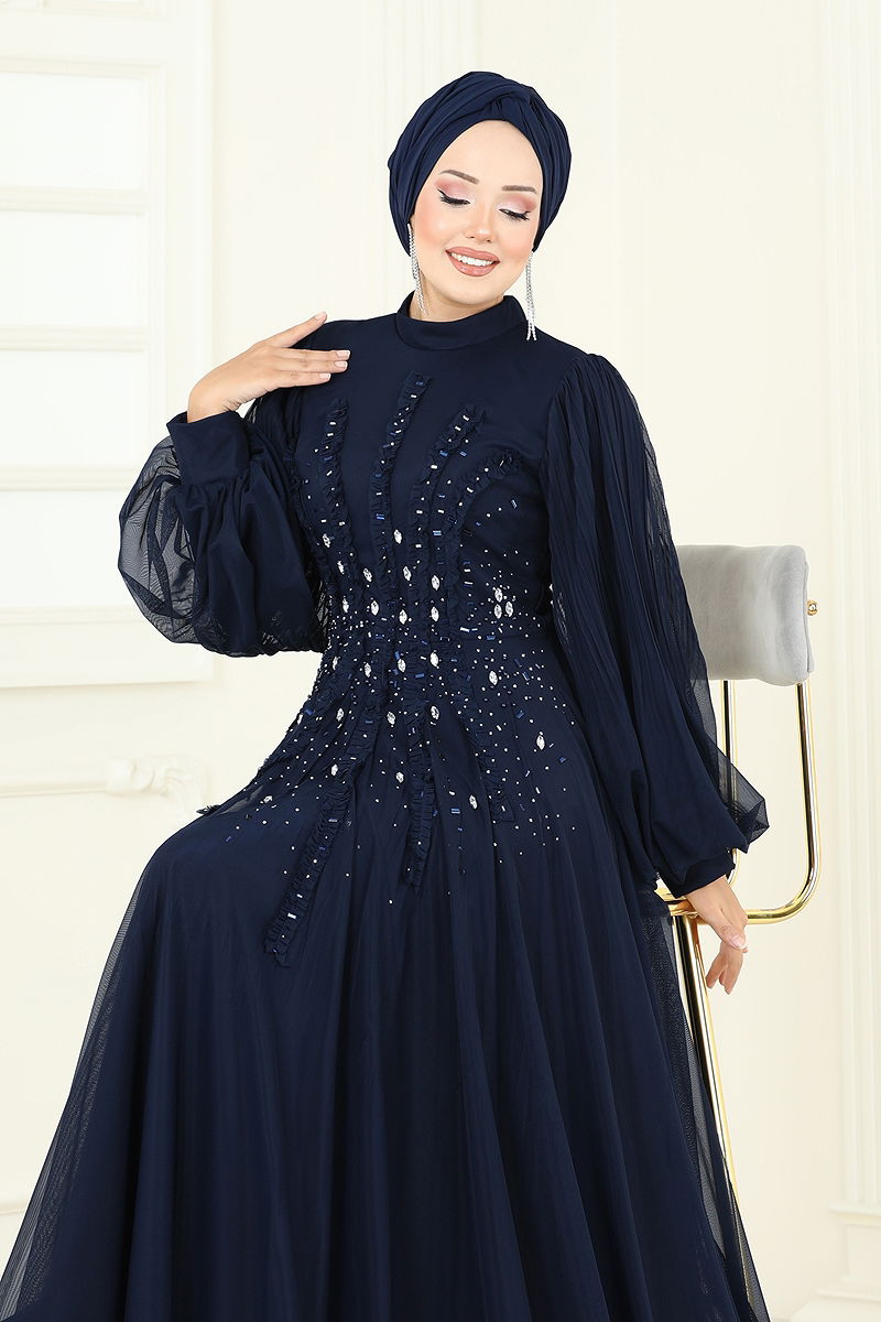 Üstün kaliteli şifon kumaştan üretilen Taşlı Şifon Tesettür Abiye, dört mevsim rahatlıkla kullanabileceğiniz zarif bir seçimdir. Model, astarlı yapıda ve sırttan fermuarlı kapamaya sahiptir. Göğüs pedi bulunan bu şık abiye, bel partisinde özel dikiş detaylarına ve çakma taş süslemelere sahiptir. Balon kollarıyla modern bir görünüm sunarken, sadece kuru temizleme ile bakımı önerilmektedir.