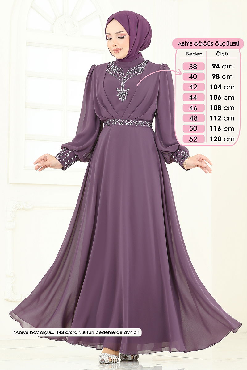 Taşlı Şifon Tesettür Abiye Koyu Lila