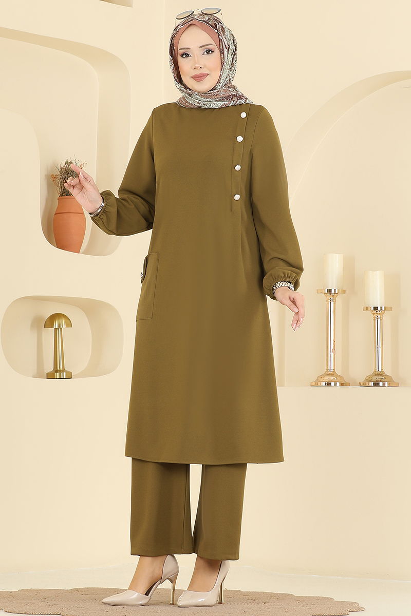 Ürün Özelliği : Yeni sezon tesettür moda ürünüdür. Sırttan kullanılabilir bir düğmesi bulunmaktadır. Ürün Bisiklet yakadır. Astarsızdır. Düğmeler aksesuardır. Cep mevcuttur. Pantolon beli lastiklidir. Manşet lastiklidir.Konsept fotoğraf çekimlerinden dolayı üründe ton farklılığı olabilir.