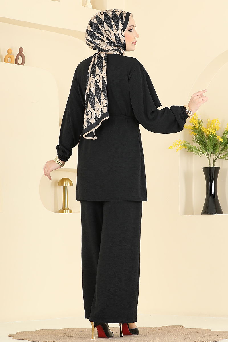 Toka Aksesuarlı Aerobin Takım, dört mevsim rahatlıkla kullanabileceğiniz bir tesettür kombinidir. Hassas yıkama ayarında 30 derecede yıkanabilen bu özel tasarım, aerobin kumaşından üretilmiştir ve bisiklet yaka özelliğine sahiptir. Astarsız olan bu model, sırtından düğmeli ve toka detaylarıyla şıklığı bir araya getirir. Bağcık detayı ile farklı kullanım imkanı sunan takım, lastikli manşetli pantolonu ile konforu ön planda tutar. Ürün üzerindeki model 38 bedendir.