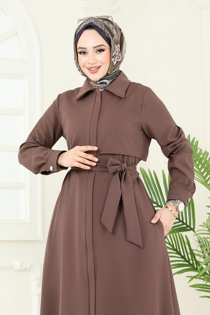 The Hidden Zipper Abaya is a stylish Islamic clothing item that can be worn comfortably across all seasons. Made from delicate woven Dabıl fabric, this model features a shirt collar design and is unlined. It stands out with its convenient front zipper. The belt at the waist is sewn at the ends to prevent waviness and can be removed if desired. Additionally, the cuffs come with active buttons for ease of use, and the broad pockets offer extra comfort. The product can be cleaned with a gentle wash at 30 degrees.