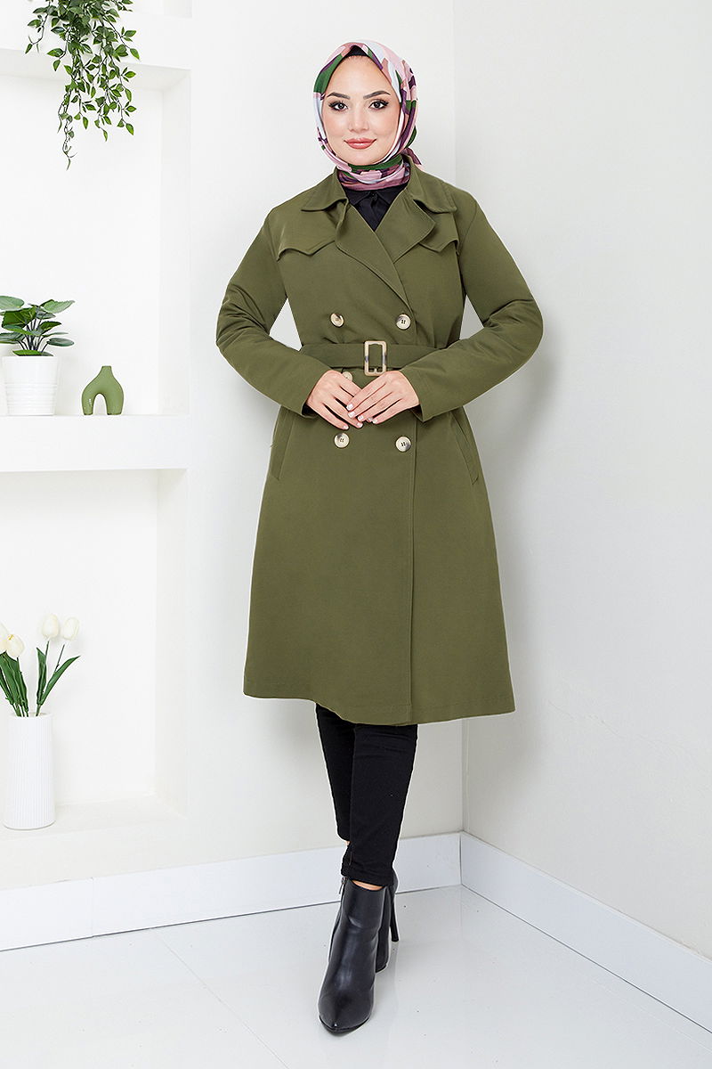 Product Feature : It is a new season hijab fashion product. The product has a Double-breasted collar. The product has From the front buttons. It is lined.. Belt included, optional not available. Pocket available. There may be a tonal difference in the product due to concept photo shoots.