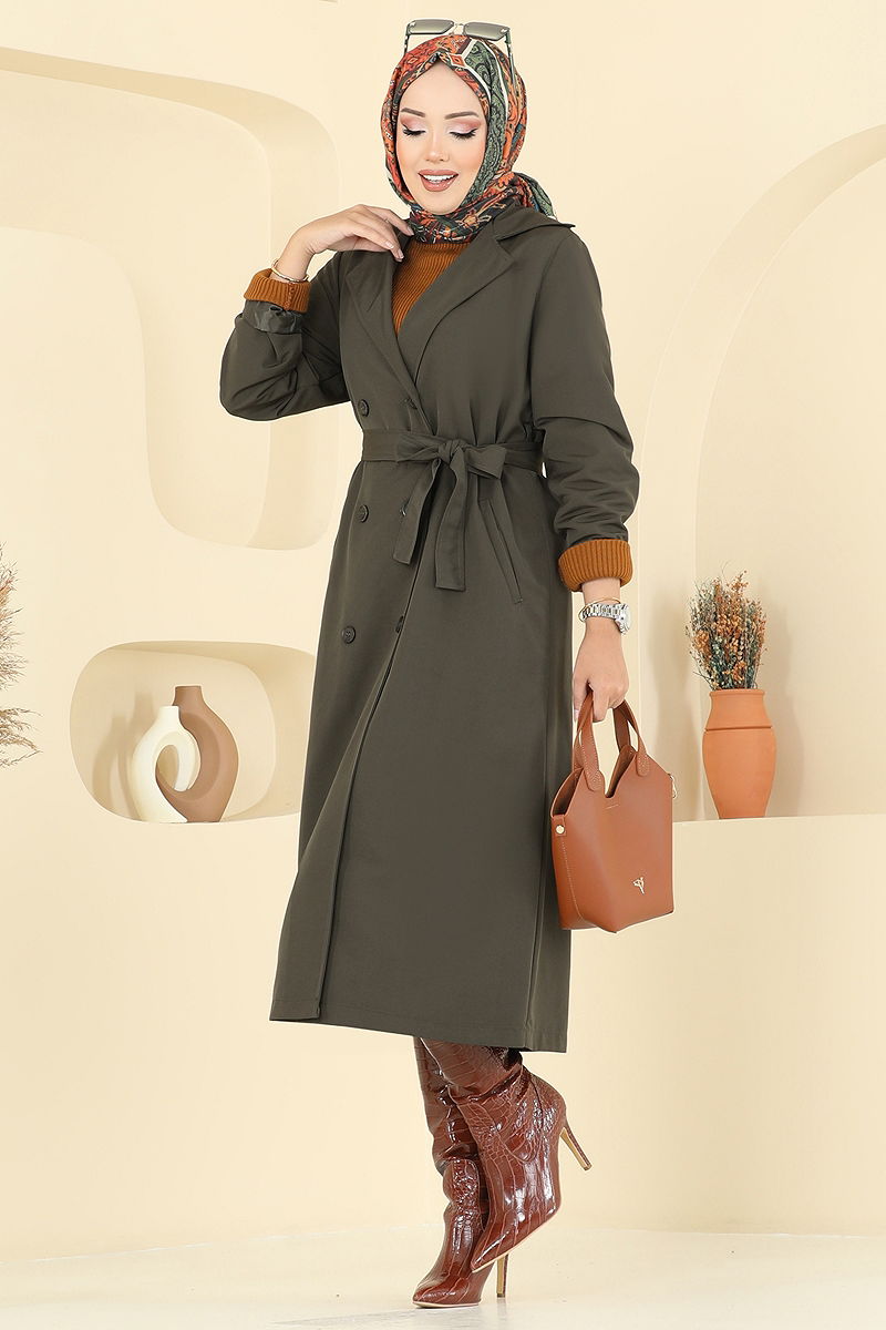 Designed specifically for the autumn and winter seasons, the Belted Trench Coat is suitable for modest fashion. Made from the delicate soff fabric, this trench coat stands out with its double-breasted collar and button-front design. The product can be washed at 30 degrees on a gentle cycle. The vent is not active and it is lined, offering ultimate comfort and elegance. The product displayed on the model is a size 38, and it is available in a variety of sizes to cater to different needs. With every detail polished, this trench coat is set to become an indispensable part of your winter wardrobe with its stylish design and practical features.