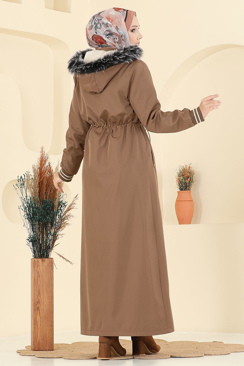 The Fur Detailed Arm Badge TRENCHCOAT is specially designed for those who love modest fashion, providing elegance during the fall and winter seasons. This coat, which should be cleaned only by dry cleaning, is made from bonded and fur fabric and has a fur-lined interior. The product is zippered in the front and comes with a detachable hood according to preference. It also features pockets for practical use. The product displayed on the model is size 38.