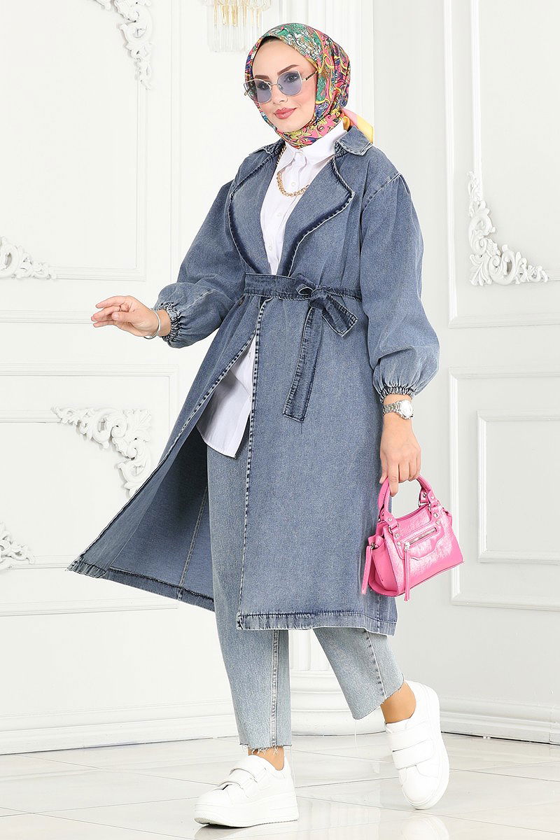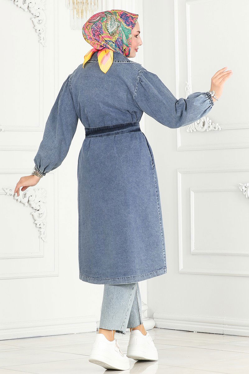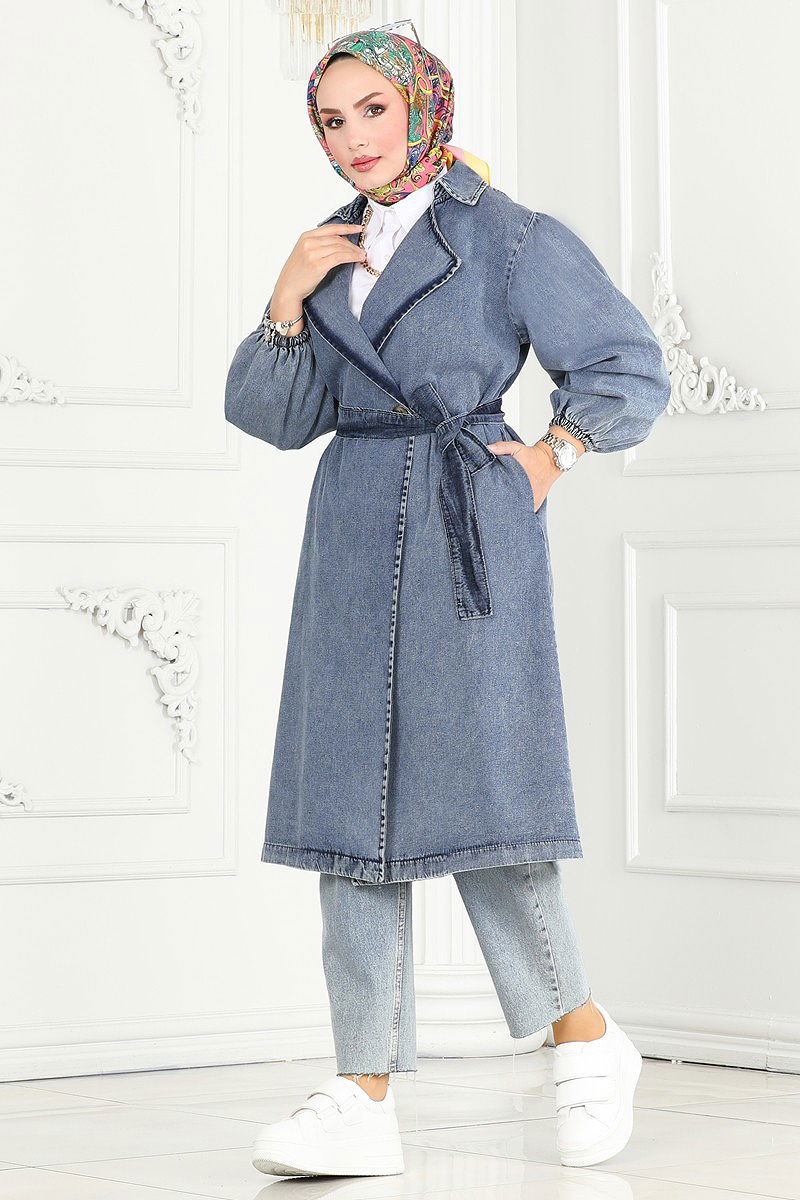 Kruvaze Collar Denim Trenchcoat is a model of modest fashion. It should be washed at 30 degrees without squeezing. It is made of first-class denim fabric. The product has a wrap collar and buttoned from the front. It is unlined. The belt has two sewn ends to prevent fluttering, and the middle part is left empty (seamless). The belt is included with the product and may be optionally used. There is a pocket. The cuff has an elastic band.