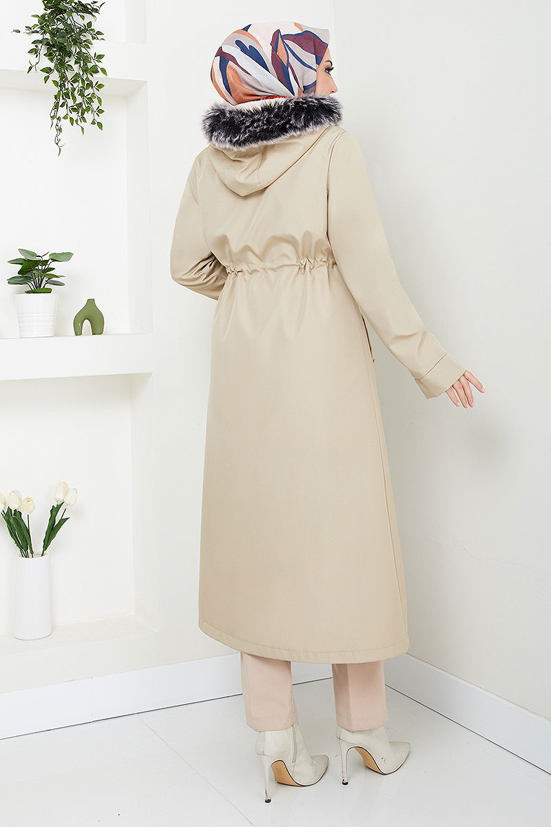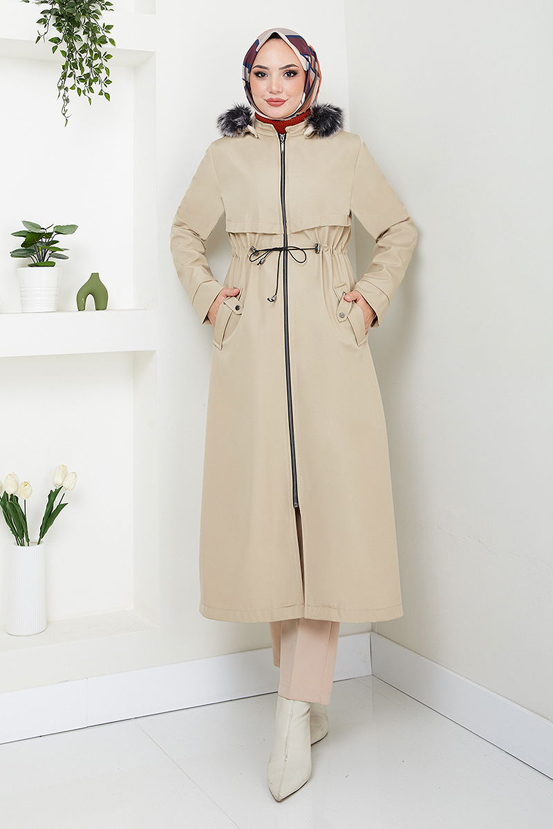 Product Feature : It is a new season hijab fashion product. The product has a Hooded collar. The lining is made of fur.. The product has a zipper at the From the front part. Hood included, optional not available. Pocket available. It has a lace-up waist. There may be a tonal difference in the product due to concept photo shoots.
