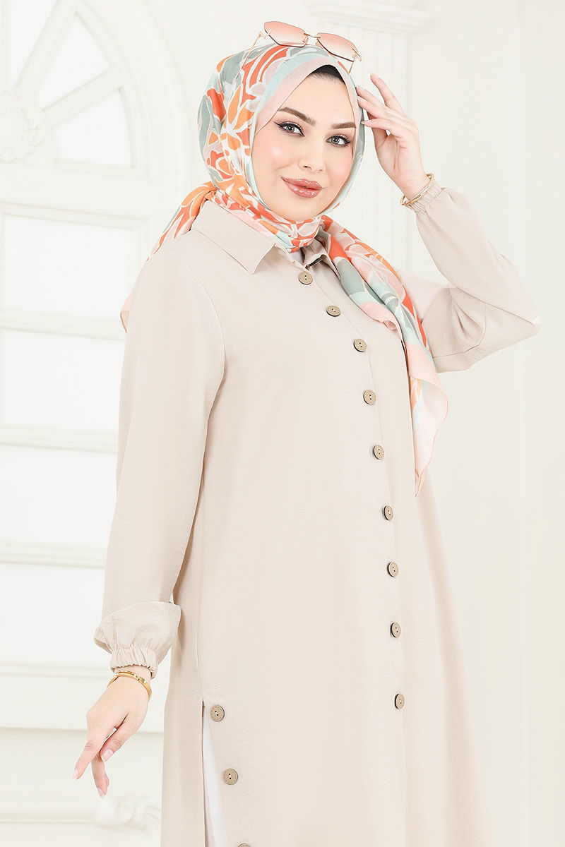 The Slit Buttoned Modest Tunic is designed for use in all seasons. Washable at 30 degrees with delicate settings, this tunic is made from aerobin fabric, ensuring durability and strength. With a shirt collar and front button design, it offers practical use while elastic cuffs ensure comfort. Accessory slit buttons add an elegant touch, making this tunic a staple in your wardrobe with its refined details.