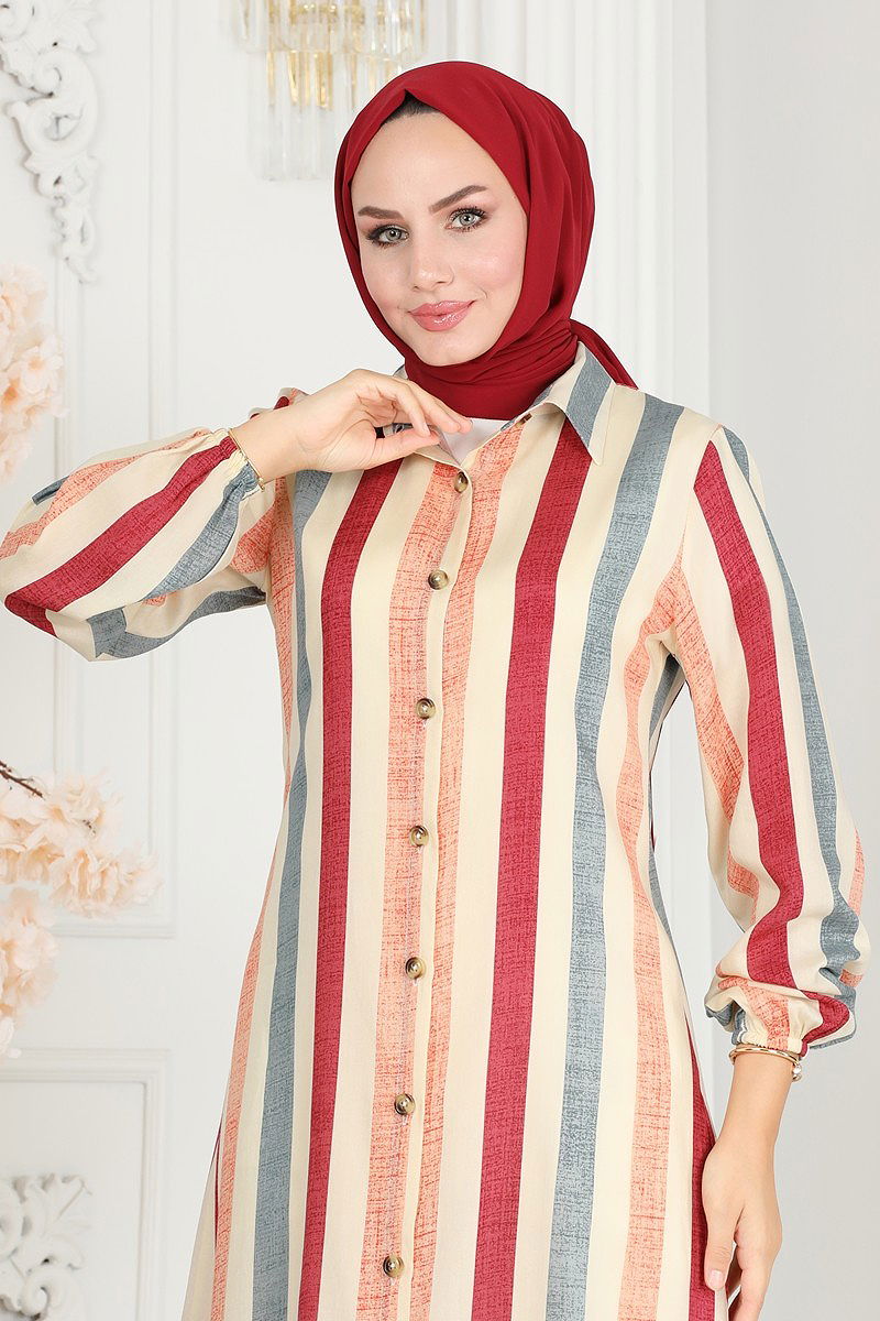 Striped Viscose Tunic is a hijab model. Can be used in Spring and Summer seasons. Hand wash should be done. It is made of first class Viscose fabric. The product has a Bicycle collar. The product is front buttoned. (The product on the model is size 38.) Its cuff is elastic.