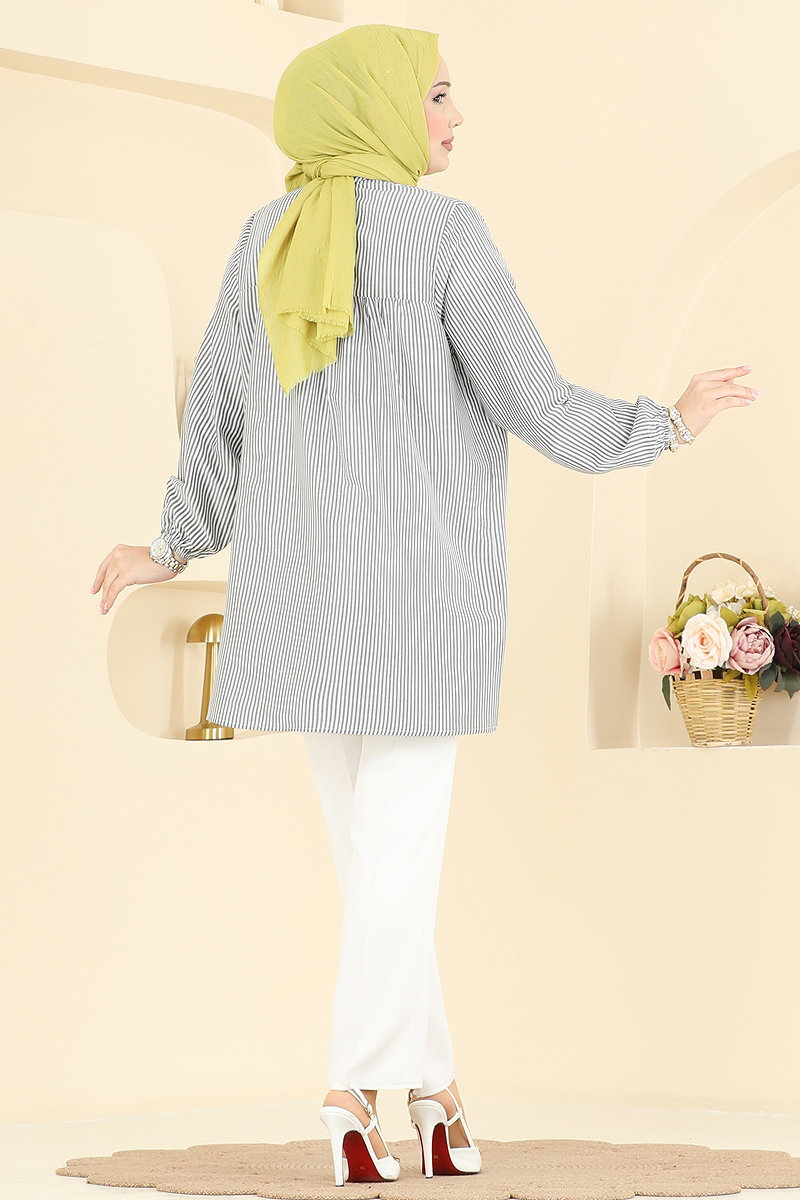 The Ruffle-Detailed Striped Tunic is an ideal product for modest clothing, suitable for all seasons. Made from terrycotton fabric, it offers comfort and can be washed at 30 degrees on a gentle cycle. Featuring a stand-up collar and half-button front, this tunic is easy to wear. It supports a sleek look with its elasticated cuffs. The product is demonstrated in size 1 on the model.
