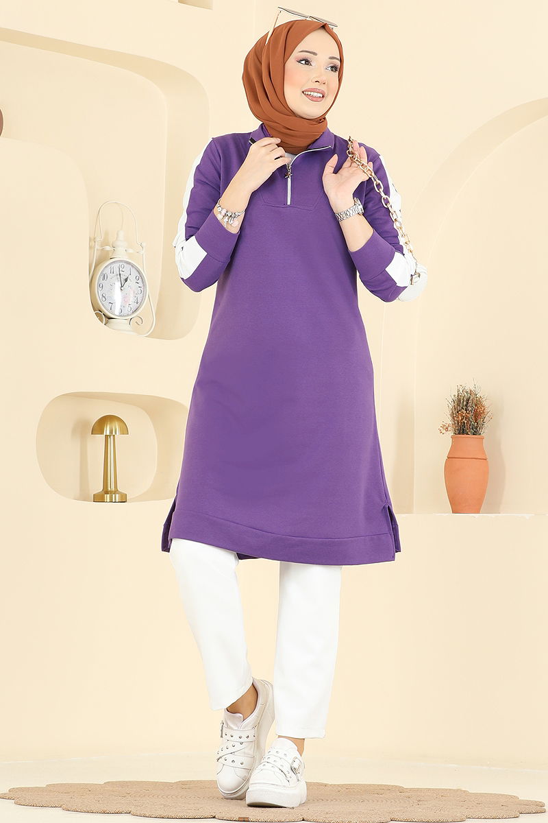 Striped Sleeve Two Thread Tunic offers comfort and elegance in one, suitable for all seasons as a modest tunic model. Crafted with delicate manufacturing techniques, this tunic can be cleaned with a gentle wash at 30 degrees. Featuring a two-thread fabric, this piece has a standing collar and side slits providing a contemporary look, while the half zipper on the front adds to its practicality. Combine this stylish and functional tunic easily with your daily outfits.