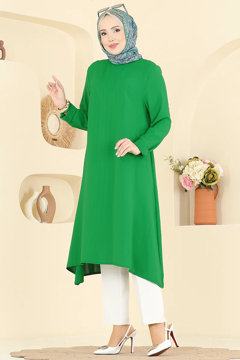 The Solid Color Classic Tunic is a timeless fashion piece perfect for all seasons. This delicately crafted tunic can be washed at 30 degrees and offers practicality with its washable feature. Made from imported crepe fabric, it features a crew neck with a buttoned back and is without lining. This tunic, a staple in modest wear, ensures elegance in any setting.