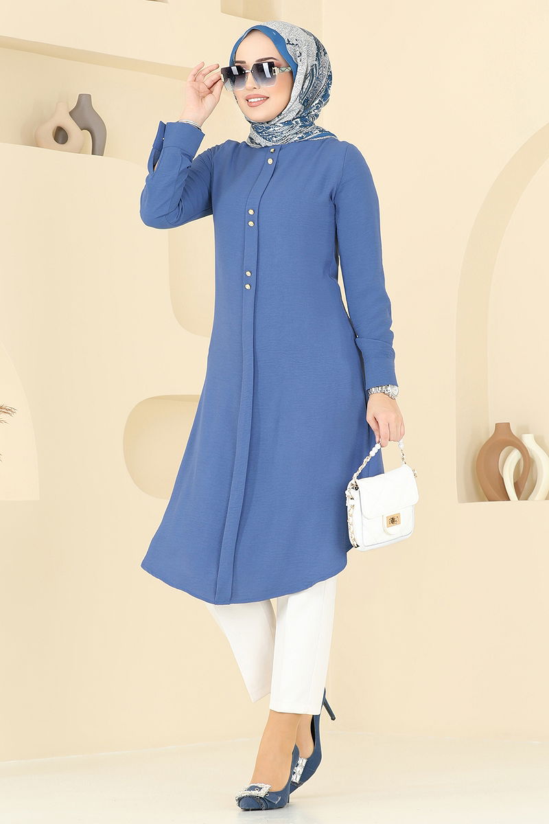 Product Name: Accessory Buttoned Aerobin Tunic. This chic and modern model is a modest clothing option that can be comfortably used across all four seasons. Its special aerobin fabric offers comfort with its lightweight and breathable structure. The bike neck and the active buttons on the cuffs add elegance to its look. It can be washed gently at 30 degrees and its lining-free design provides excellent usability. (The product on the model is size 38.)