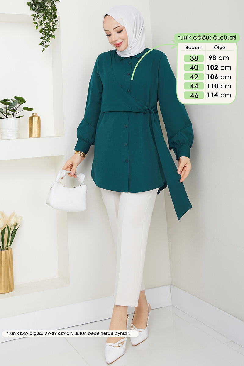 Product Feature : It is a new season hijab fashion product. It has a belt that can be fastened from the side. The product has a Shirt collar. The product has From the front buttons. Unlined. Belt is sewn to the product. Cuff buttons are active. There may be a tonal difference in the product due to concept photo shoots.