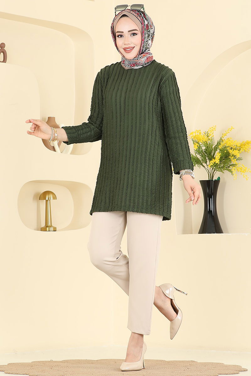 The Ribbed Detail Knit Tunic is a standout modest wear piece, suitable for all seasons. Made from carefully selected Amazon knit fabric, this tunic offers a lightweight and comfortable structure. Its bicycle neck design provides a modern look, while its unlined structure increases comfort. It can easily be washed in a gentle 30-degree cycle.