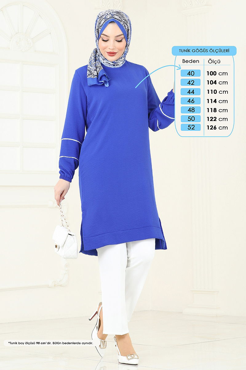 Biyeli Hijab Tunic is a versatile piece that can be worn in all seasons, made from aerobin fabric. It features a bike neck and side slit design offering a modern look, while its elastic cuffs are crafted for comfort. Recommended to be washed gently at 30 degrees, this tunic is unlined for a lightweight and comfortable wear. The product is displayed on a model wearing size 40.