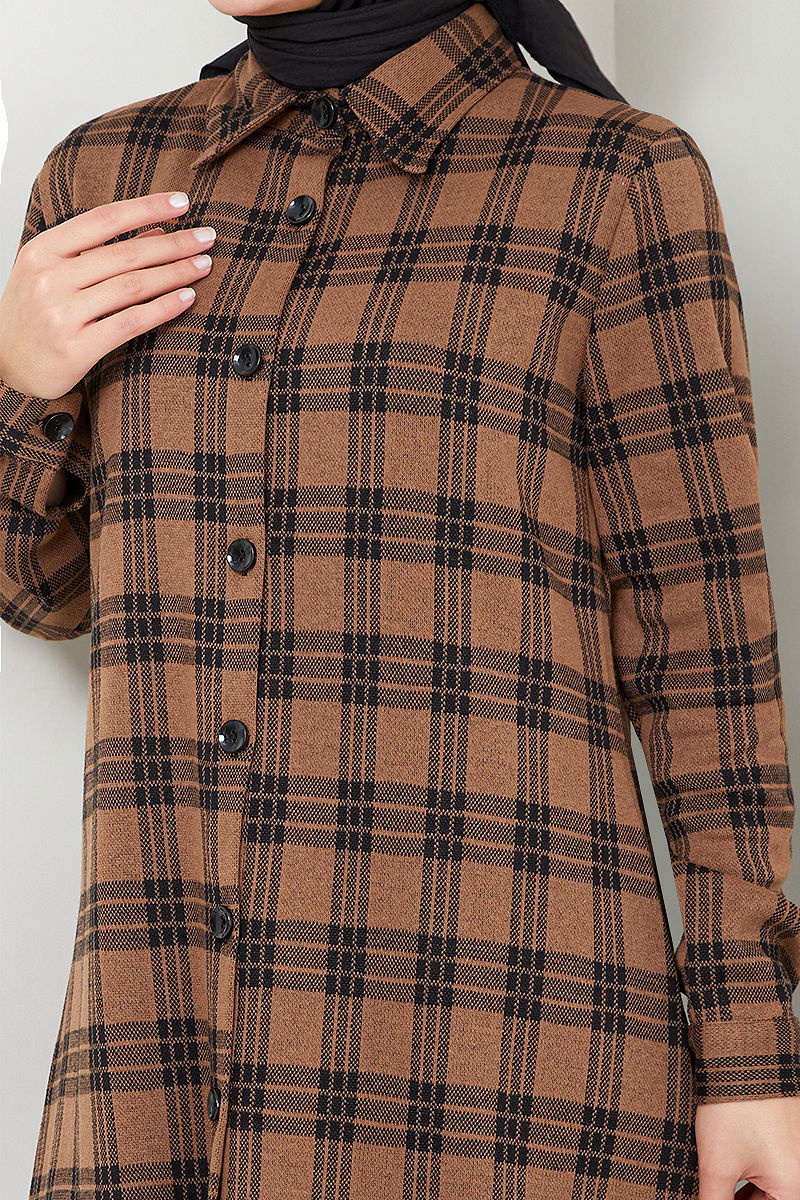 Shirt Collar Checked Tunic model is a hijab product. It can be used in Autumn and Winter season. It should be washed at 30 degrees without wringing. It is made of first-class Checked fabric. The product has a shirt collar. The product is buttoned from the front. It is unlined. (The product on the model is size 38.) Cuff buttons are active.