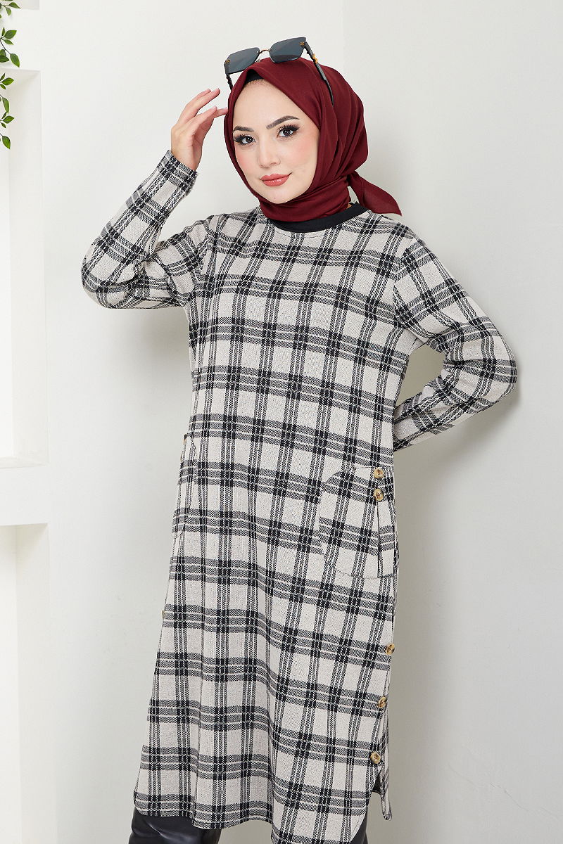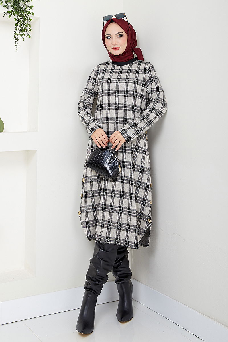 Accessory Buttoned Plaid Tunic is a model of hijab product. It can be used in Fall and Winter season. It should be washed at 30 degrees without squeezing. The product has a bicycle collar. The slit buttons are accessories. It is unlined. (The product on the model is size 38.) It has a button at the back for use. There is a pocket.