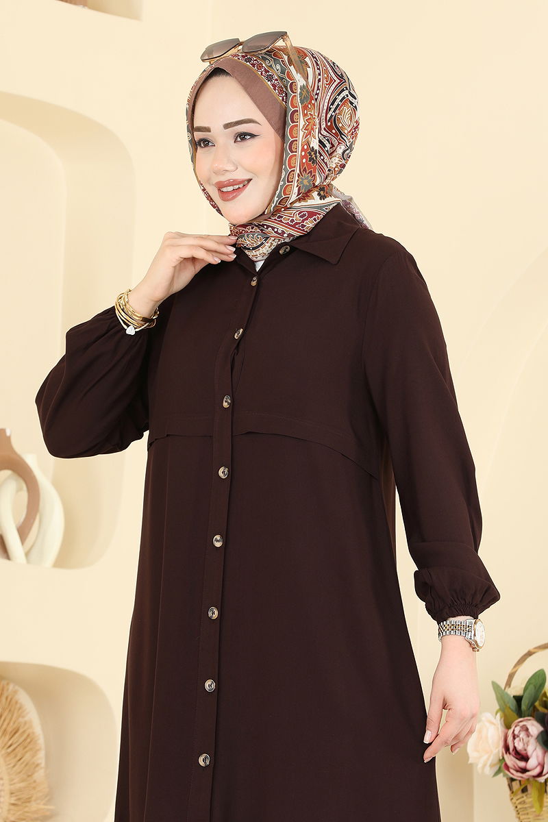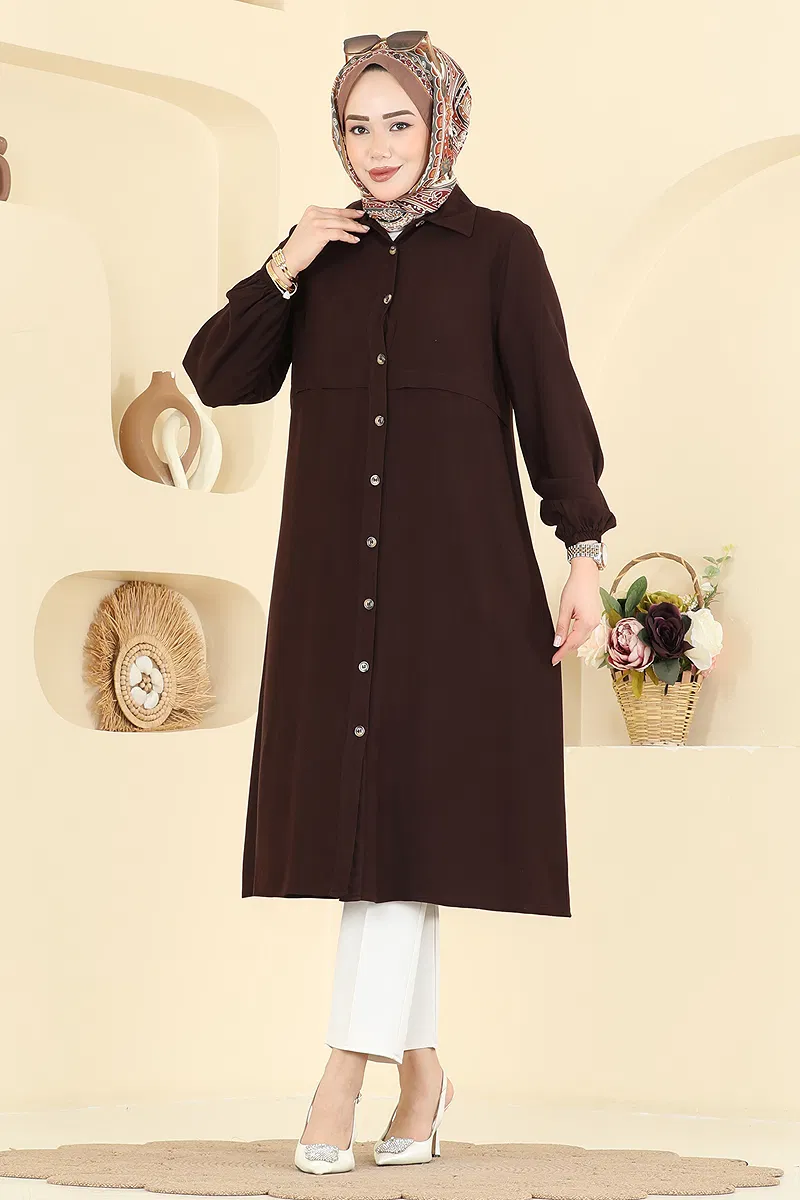 Complete your elegance with the Button Detailed Belmando Tunic, a modest wear model suitable for all seasons. This tunic, which can be washed at 30 degrees due to its delicate fabric structure, showcases a modern look with shirt collar and front button details. With its front slit and elasticated cuffs, it prioritizes comfort, making it ideal for a dynamic and chic appearance.