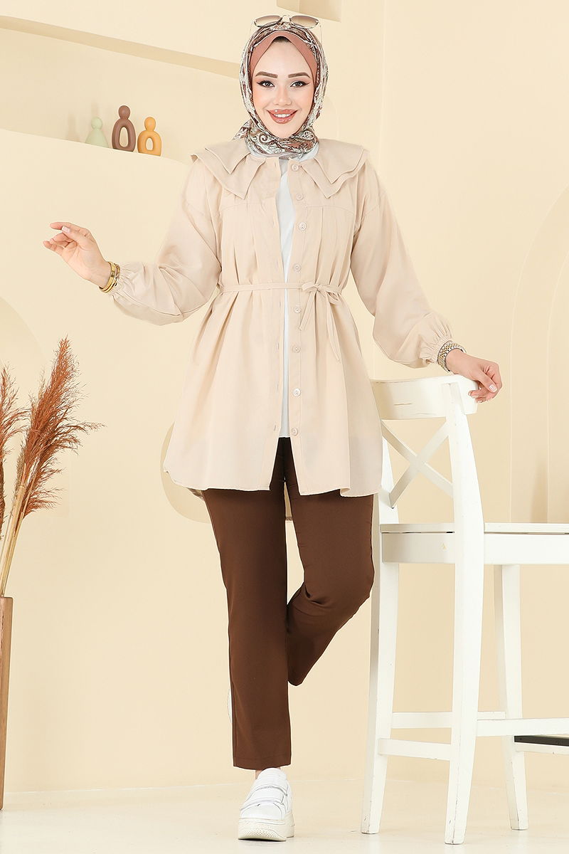 المنتج لديه ياقة بيبي. المنتج به أزرار من الأمام. غير مبطنة. الحزام متضمن، ،يمكن استخدامها حسب الرغبة السوار مطاطي. قد يكون هناك اختلاف في الدرجة اللونية في المنتج بسبب التقاط الصور الفوتوغرافية.