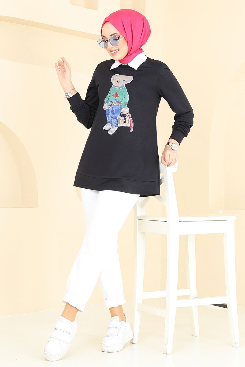 Teddy Print Tunic is a stylish and comfortable modest wear option. Suitable for all seasons, this tunic is made from dual-thread fabric. It features a crew neckline and is unlined, making it light and practical for everyday wear. The unique print patterns accentuate your style. For care, it is recommended to wash the product inside out and iron it on the reverse side. (The product shown on the model is size 38.)