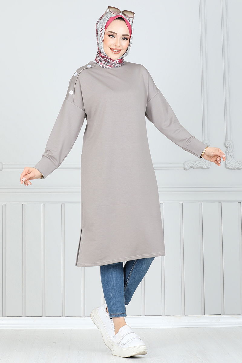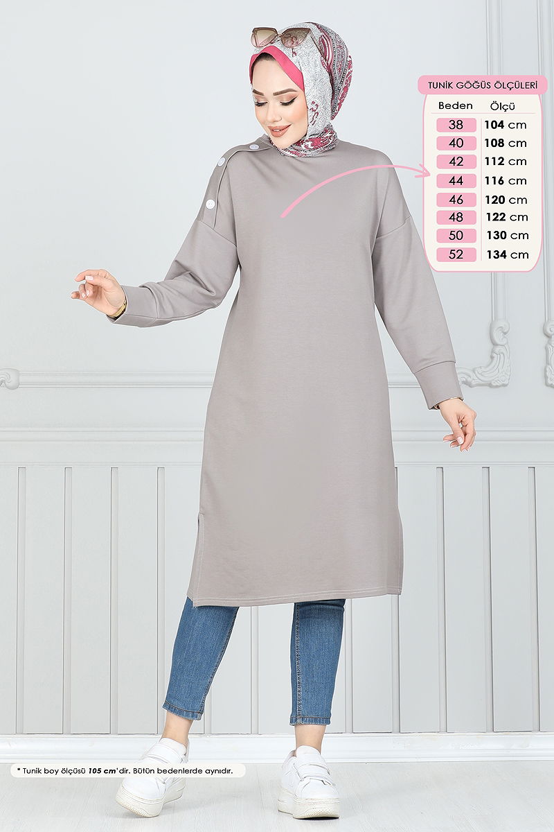 The Accessory Buttoned Hijab Tunic is a modest wear suitable for all seasons. It features a delicate wash at 30 degrees, making it easy to maintain. Crafted from Crystal Two Strand fabrics, our tunic has a crew neck and side slit details. Its unlined design provides a light and comfortable fit. The dimensions are 165 cm length, 88 cm chest, 68 cm waist, 99 cm hips, and it weighs 56 kg. It's designed to prioritize both your style and comfort.
