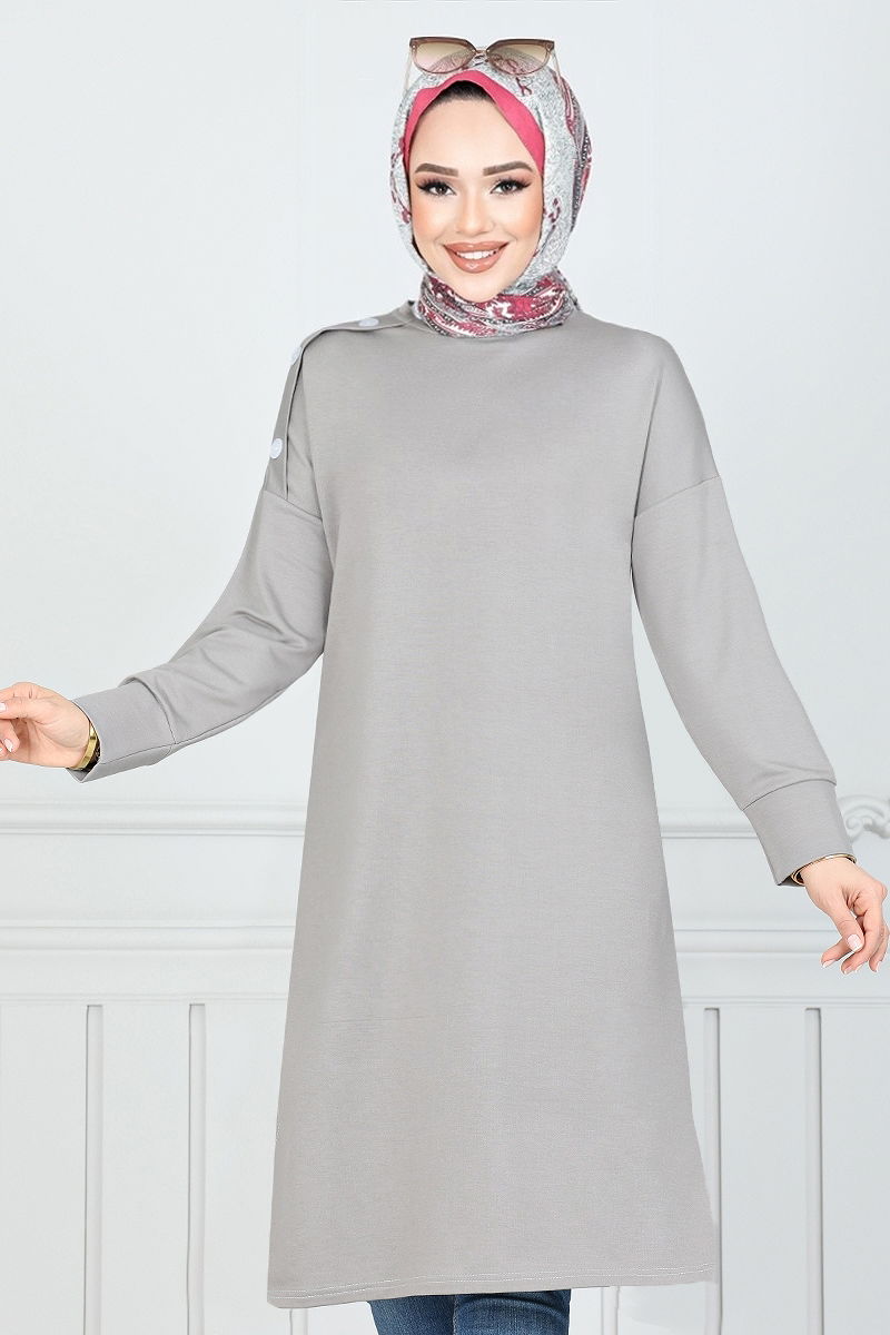 Experience both comfort and elegance with our Shoulder Buttoned Hijab Tunic, designed for all-season wear. This tunic, which requires gentle washing at 30 degrees, stands out with its crystal two-thread fabric. Enjoy a modern touch with its bike neck design and side slit details. Feel the lightness with its unlined structure. The accessory buttons on the shoulders complete your elegance.