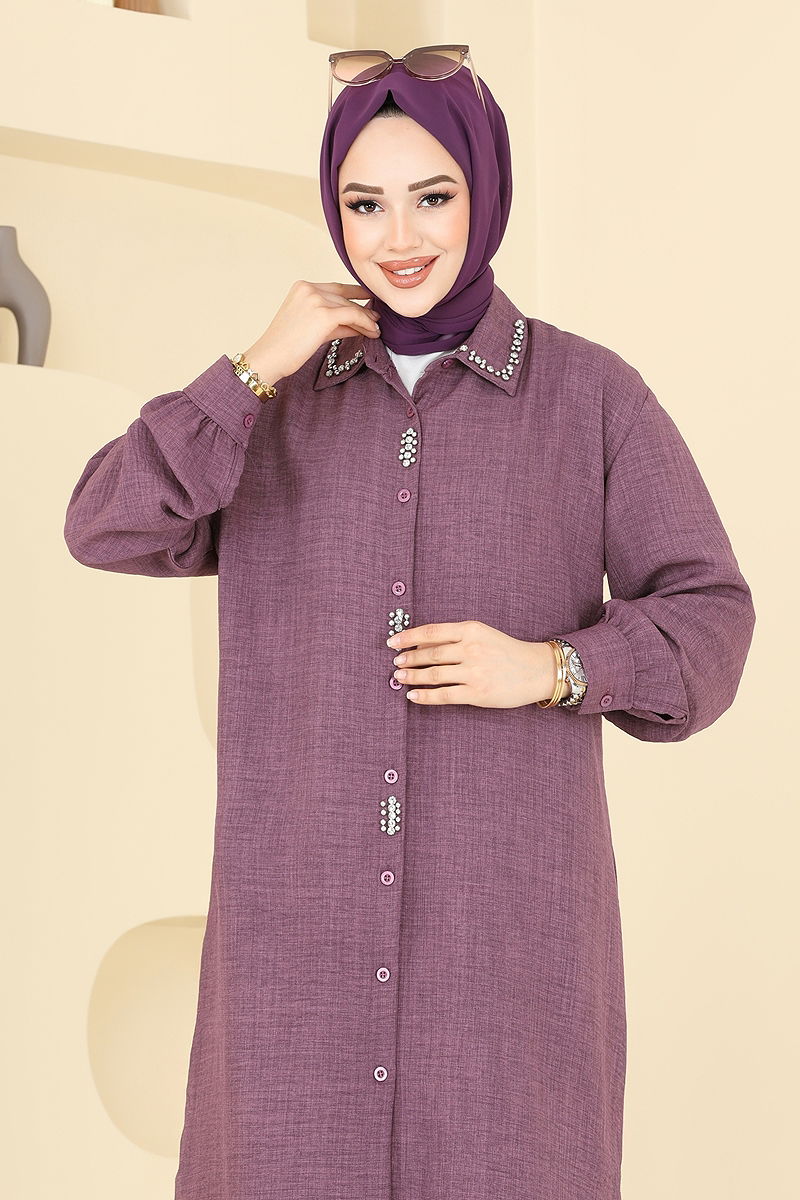 Product Feature : It is a new season hijab fashion product. The product has a Shirt collar. The tunic has a side slash.. Unlined. Stone details are pebble. Cuff buttons are active. There may be a tonal difference in the product due to concept photo shoots.