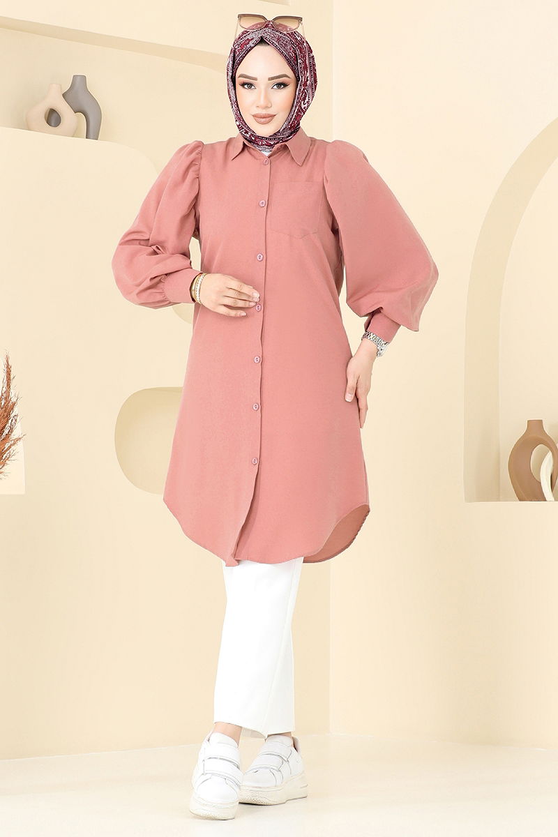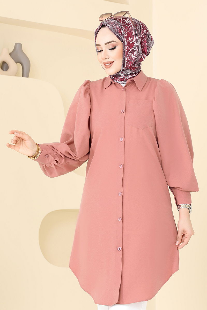 The Balloon Sleeve Hijab Tunic is a modest wear item that can be comfortably used in all seasons. It offers practical use with its machine washable feature at 30 degrees on a gentle cycle. Made from terrycotton fabric, it is durable. Its elegant shirt collar and front-button design ensure you stay stylish in any setting. With active breast pocket and cuff buttons, it promises functional use. The lining-free design offers a light and comfortable experience.