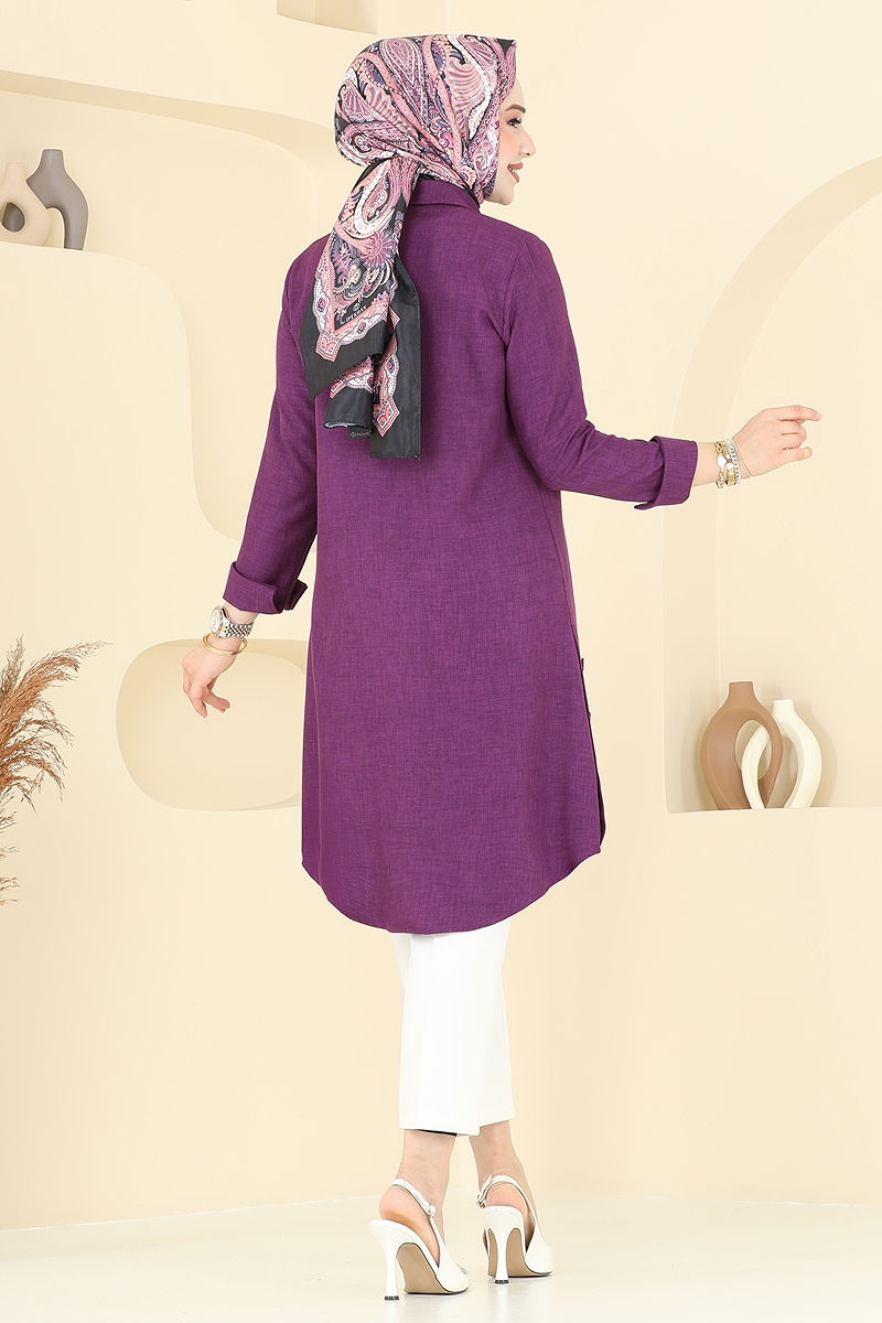 The Slit Buttoned Linen Tunic is an ideal choice for those who prefer modest clothing. This tunic, which can be comfortably worn in all four seasons, can be washed at a gentle 30 degrees. Made from quality linen fabric, this product features a shirt collar and a front button design that stands out. It offers comfortable use with its unlined structure and active cuff buttons. The product worn by the model is a size 38.