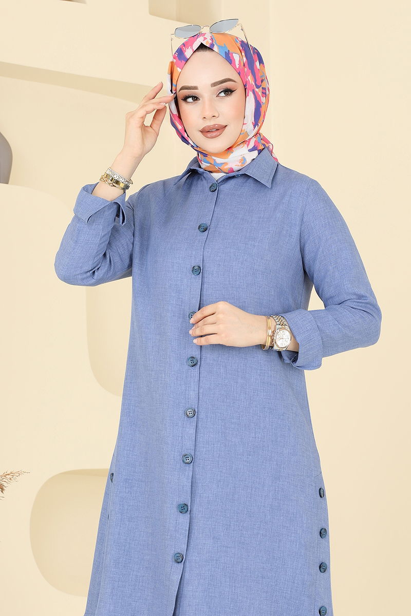 The Slit Buttoned Linen Tunic is an ideal choice for those who prefer modest clothing. This tunic, which can be comfortably worn in all four seasons, can be washed at a gentle 30 degrees. Made from quality linen fabric, this product features a shirt collar and a front button design that stands out. It offers comfortable use with its unlined structure and active cuff buttons. The product worn by the model is a size 38.