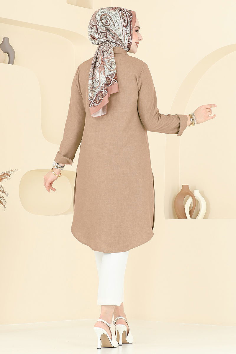 The Slit Buttoned Linen Tunic is an ideal choice for those who prefer modest clothing. This tunic, which can be comfortably worn in all four seasons, can be washed at a gentle 30 degrees. Made from quality linen fabric, this product features a shirt collar and a front button design that stands out. It offers comfortable use with its unlined structure and active cuff buttons. The product worn by the model is a size 38.