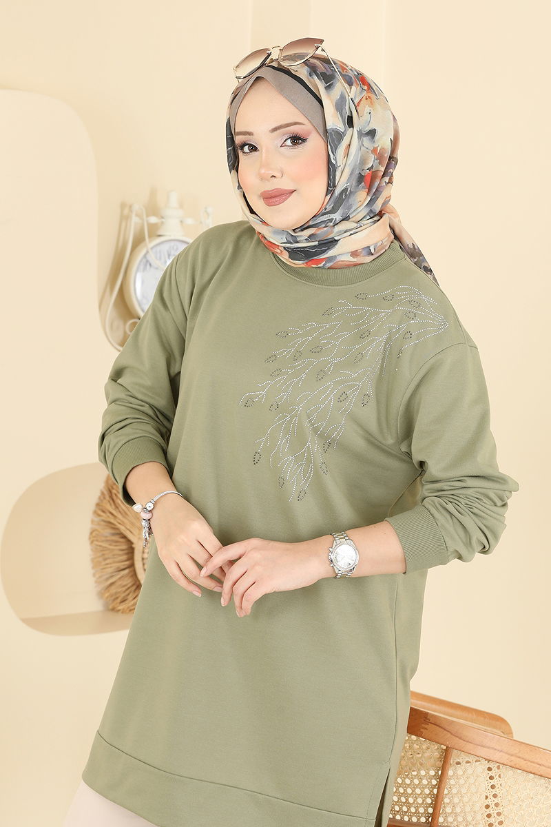 Discover elegance and comfort together with the Leaf Patterned Two String Tunic! This tunic can be comfortably worn in all four seasons and can be cleaned with a gentle wash at 30 degrees. Made from a special two-thread fabric, it is durable and long-lasting. It features a bicycle neckline and side slit details for a modern look. Its lining-free design provides maximum comfort and does not show the inside. Elevate your elegance with stone details!