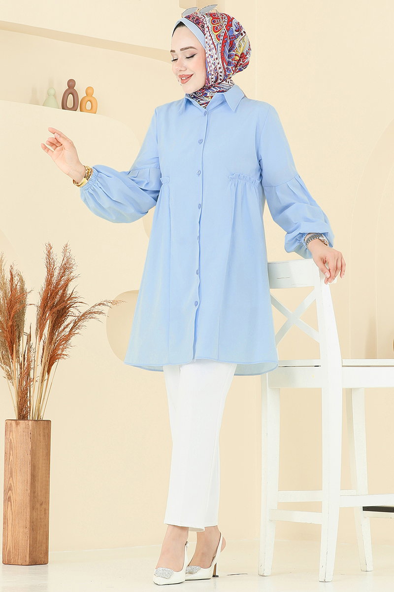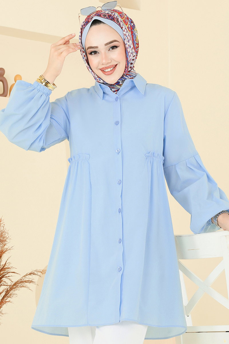 The Shirt Collared Tunic is an ideal modest wear piece that blends design and comfort for all seasons. This product can be washed at 30 degrees on a gentle cycle and is made from terrycotton fabric. Its shirt collar and front button design add elegance while the elastic cuffs enhance ease of use. The unlined structure offers a light and comfortable fit. The product displayed in size 38 gives a perfect idea of the fit.