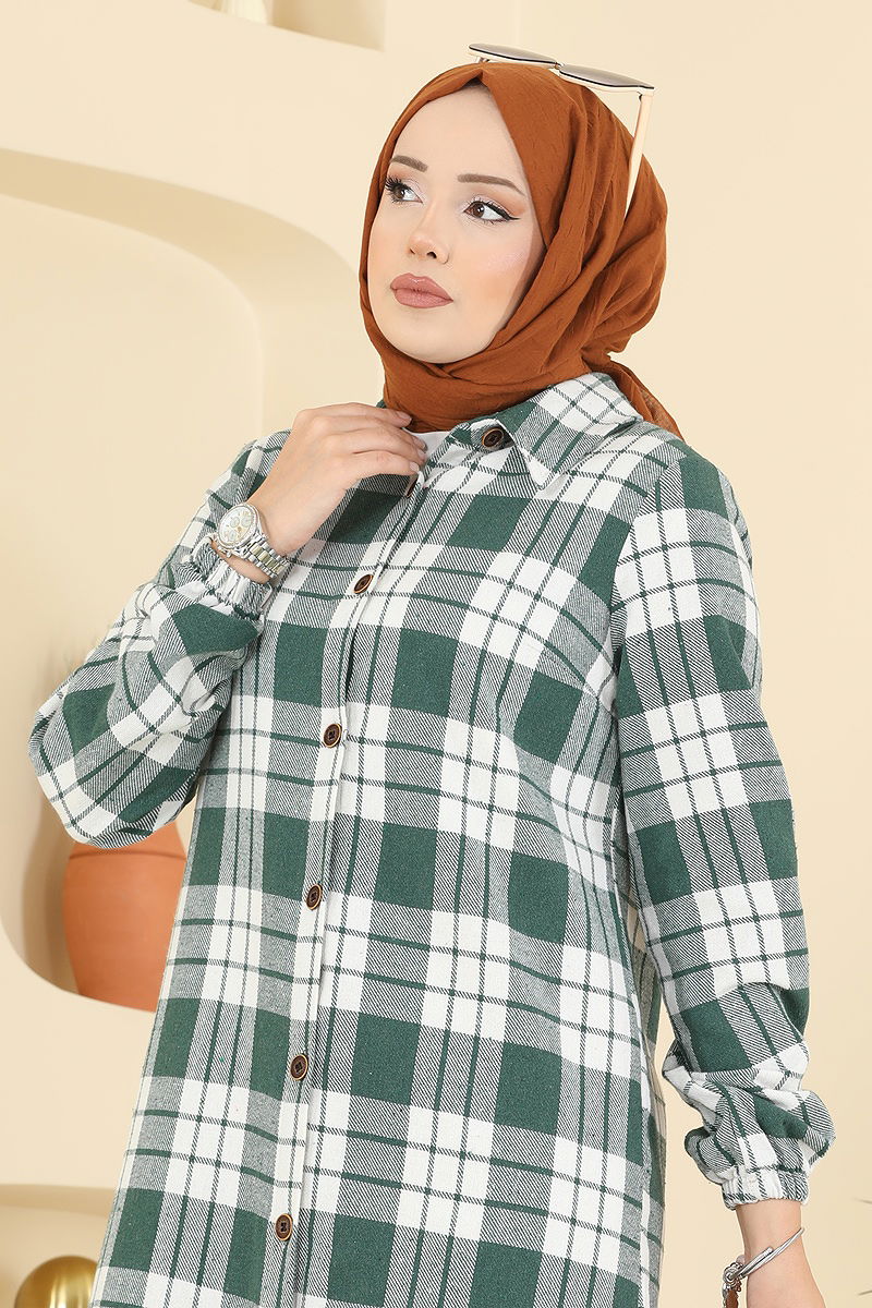 Colorful Patterned Plaid Tunic is an ideal choice for autumn and winter seasons. This tunic, which can be washed delicately at 30 degrees, is made from plaid fabric. It offers a stylish look with a shirt collar and buttons on the front, while its unlined structure and elastic cuffs ensure comfort. The model in the product is size 38 and is suitable for modest fashion.