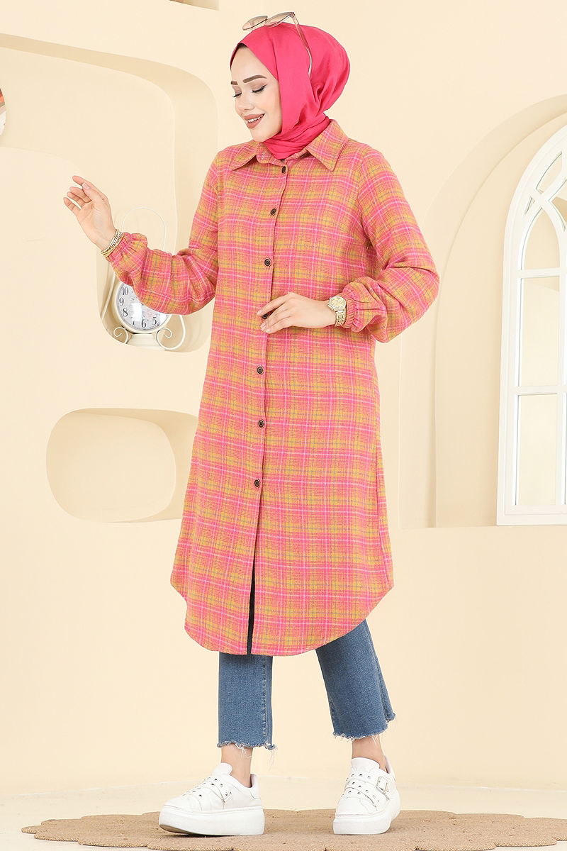 Colorful Patterned Plaid Tunic is an ideal choice for autumn and winter seasons. This tunic, which can be washed delicately at 30 degrees, is made from plaid fabric. It offers a stylish look with a shirt collar and buttons on the front, while its unlined structure and elastic cuffs ensure comfort. The model in the product is size 38 and is suitable for modest fashion.